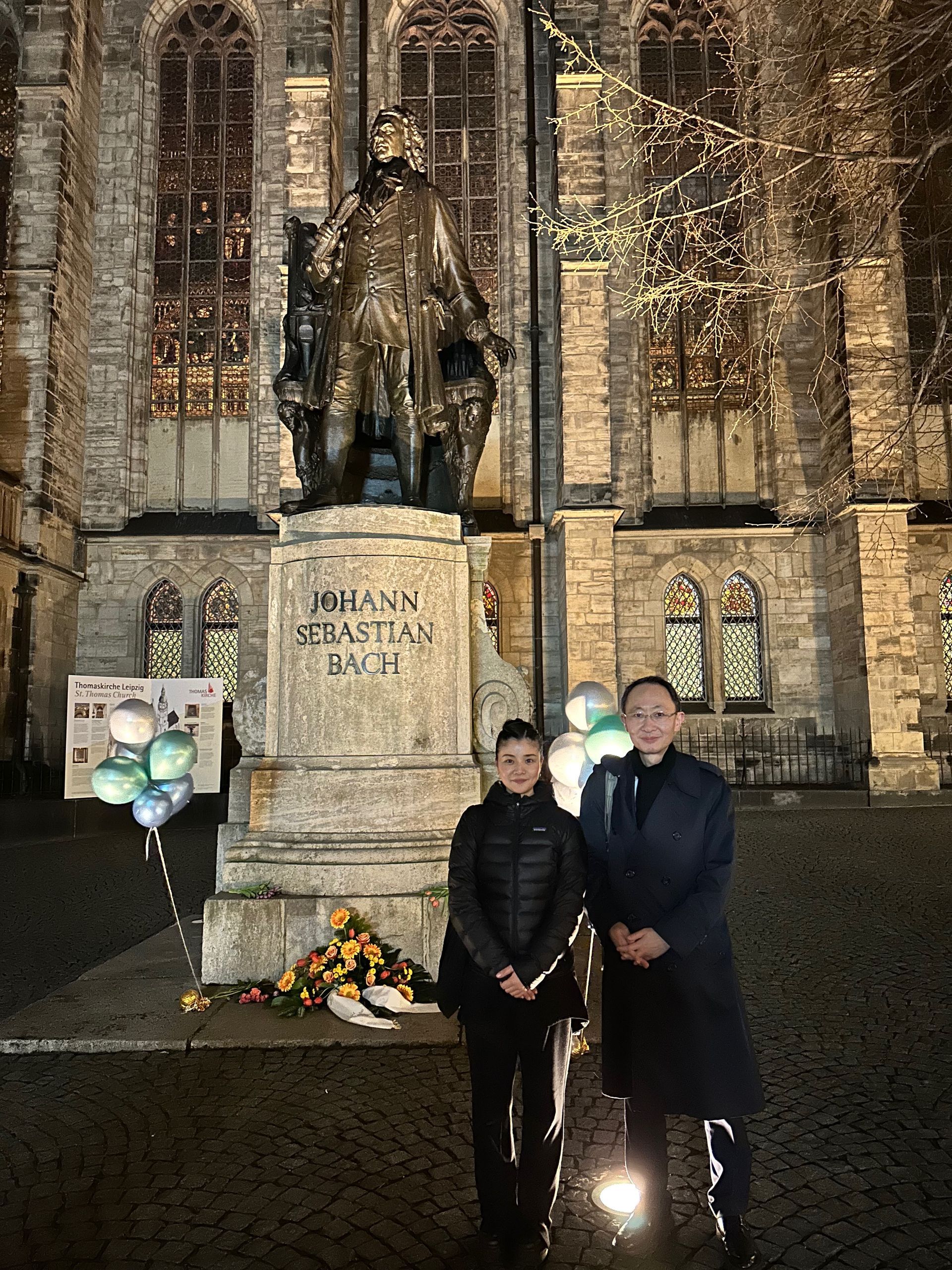 私のライプツィヒでの初めてのパフォーマンスは、言葉にできないほど素晴らしい体験でした。リハーサルの前日、日独センターの松本さん、田中さんと一緒に、ライプツィヒの美しい街を散策し、音楽の父、バッハが約47年に渡る創作人生のおよそ半分を音楽監督として過ごし、バッハが永遠の眠りについた聖地トーマス教会にて、世界中の音楽会の平和と感謝、そして無数の芸術作品を生み出した偉大な父への深い尊敬の念を込めて手を合わせました。バッハが生涯を捧げた音楽の力が、時を超え、私たちの心にも響き渡っているのを感じました。