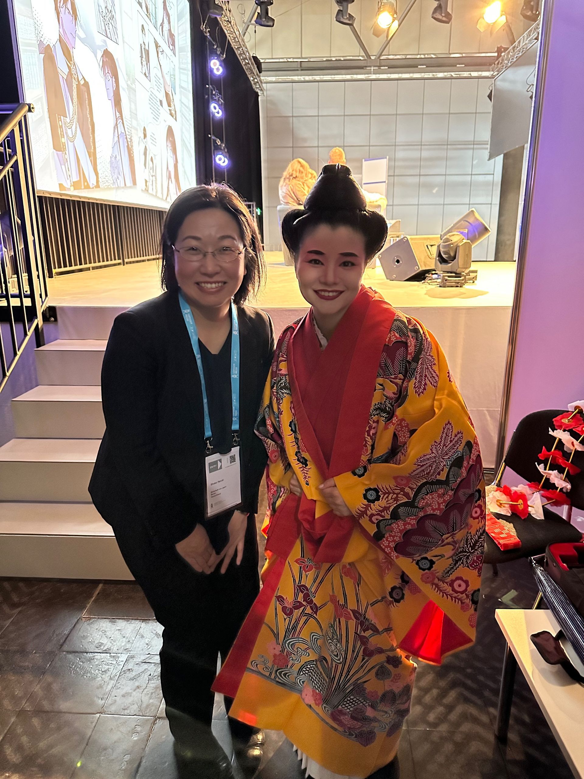 パフォーマンス前には、始まるのを待つ驚くほど多くの人々の期待に満ちた様子を裏から見て、びっくり...ヨーロッパで900人を超える観客の前でパフォーマンスをするのは初めてのことで、楽しみと同時に彼らが沖縄の芸能を楽しんでくれるかどうかの不安もありました。そのため、会場のスクリーンには沖縄の自然や芸能、食べ物、工芸品を紹介する動画を背景に流し、司会者に事前にお送りした文章を読んでもらいました。アニメのコミックフェアのブースということもあり、多くの人がコスプレをしていたため、私がアニメファンであること、「呪術回戦2」の登場人物がバケーションに行くところが沖縄という説明と共に、沖縄がかつて琉球王朝だったこと、自然を崇拝し人々を受け入れる文化についても紹介しました。私は最初に沖縄の祝儀舞踊である「かぎやで風」から始め、4曲を踊り、その後2曲を歌いました。一人でのパフォーマンスでは、早いユニフォームチェンジを行い、息を切らしながらも沖縄の民謡を2曲歌うことができ、大きな喜びを感じていました。そして、大きな手拍子と暖かい拍手に、感無量!