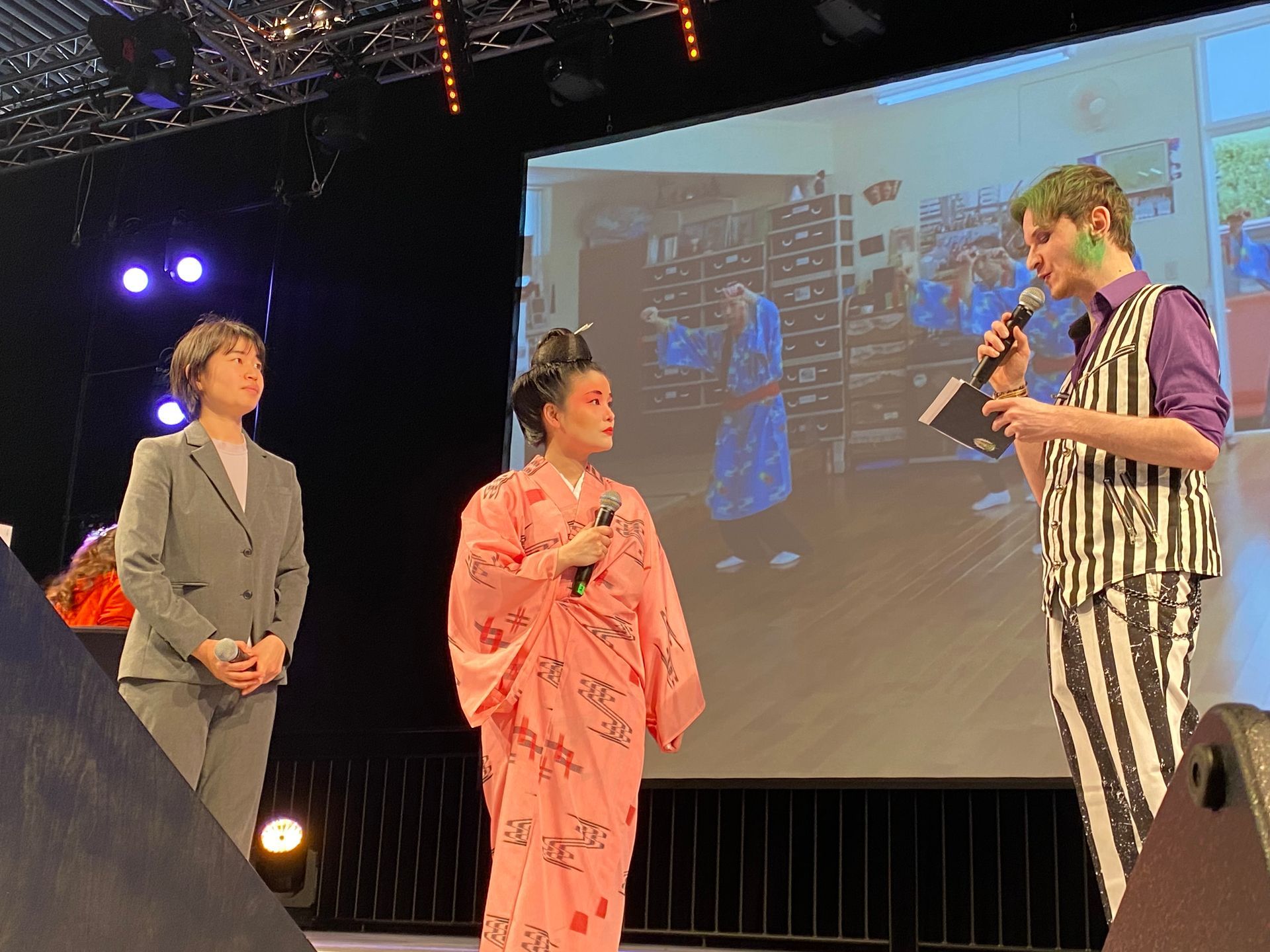 Before the performance, as I observed from backstage the eager anticipation of the surprisingly large audience waiting for the performance to start, I was taken aback... Performing in front of an audience of over 900 people in Europe for the first time brought excitement and anxiety about whether they would enjoy the Okinawan entertainment. Therefore, the venue's screen displayed videos introducing Okinawa's nature, performing arts, food, and handicrafts, and the host read the document I had sent beforehand. Since it was a booth at an anime comic fair, and many people were in cosplay, I included that I am an anime fan and explained that Okinawa is the vacation destination of characters in "Jujutsu Kaisen 2", along with the fact that Okinawa was once the Ryukyu Kingdom and has a culture of worshiping nature and welcoming people. I started with Okinawa's celebratory dance, "Kagiyadefu," danced four pieces, and then sang two songs. In my solo performance, I managed quick costume changes and, despite being out of breath, was able to sing two Okinawan folk songs, feeling immense joy. The enthusiastic handclapping and warm applause were overwhelming!